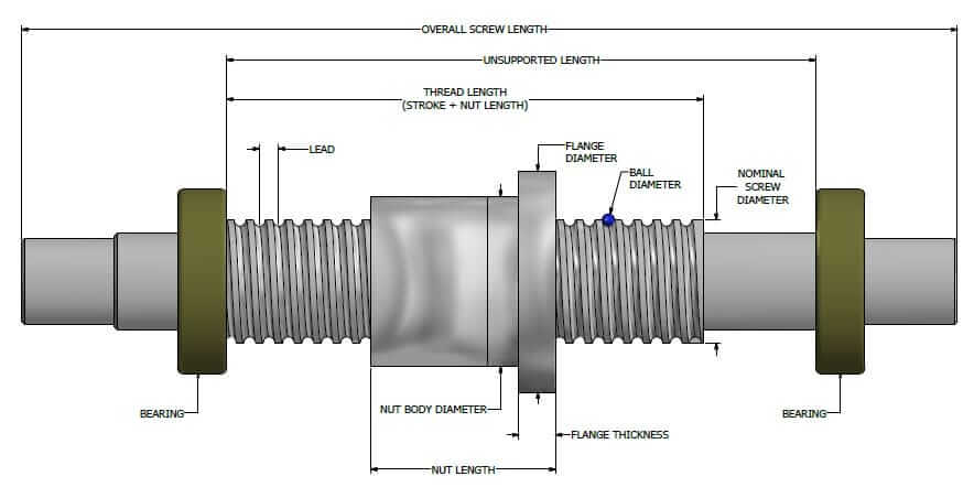 Một bộ trục vít me (Ball Screw Assembly) gồm các thành phần chính: